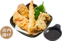 大切りサーモン天、さつまいも天、大えび天、まいたけ天、大葉天と、旬の味わいをそろえた。