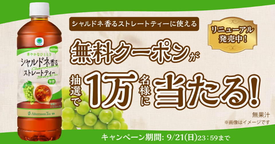 ファミリーマートは、Afternoon Tea(アイビーカンパニー)監修の「ファミマル シャルドネ香るストレートティー」を発売した。600mLペットボトルで価格は118円。さらに9月12日~21日には無料クーポンが当たるキャンペーンも実施する。