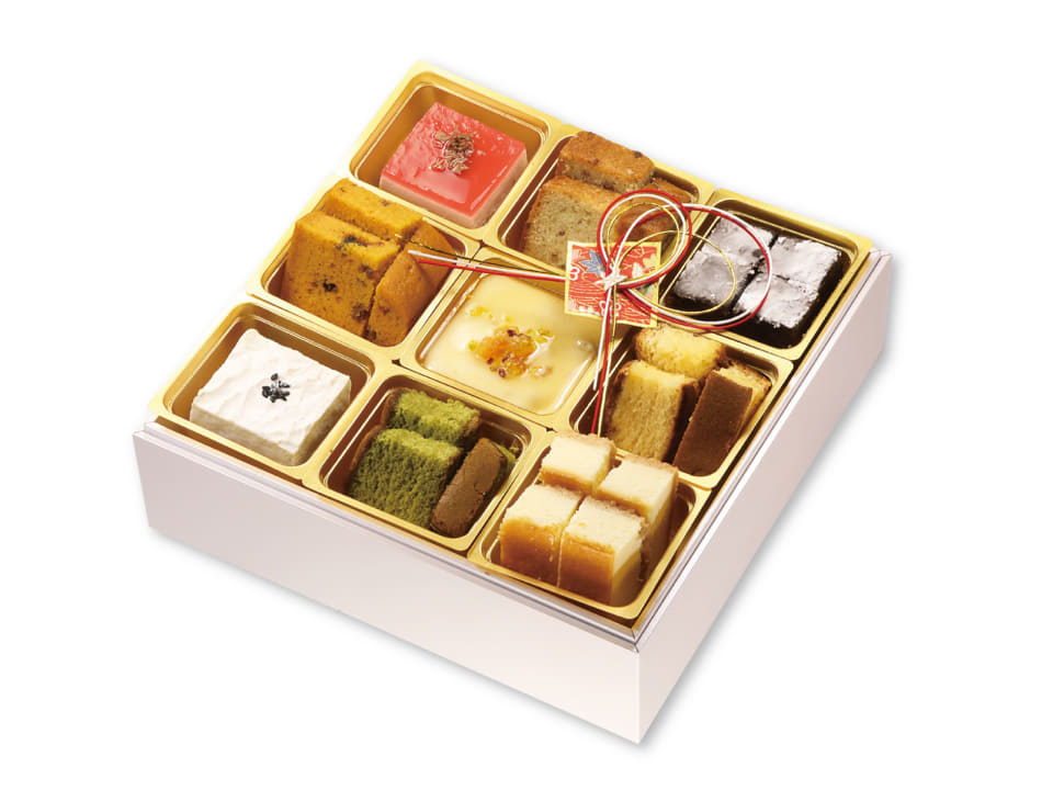 晴れの日に相応しい、和菓子と洋菓子が入った華やかなスイーツおせち。甘酸っぱいラズベリーの香りとなめらかなムースが楽しめる「ラズベリームースケーキ」や、九州産和栗入りでしっとり食感の「和栗パウンドケーキ」など全9品が入っている。