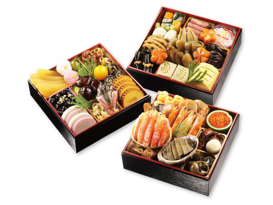 ホタテやブリ、サーモン、数の子、ローストビーフといった人気の海の幸や肉などを詰め合わせている。