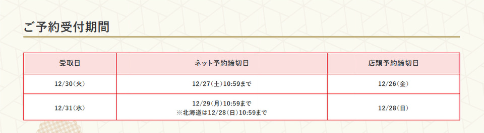 2026年のおせちは、国産原料のみを使用した商品や昨年好評だった監修おせちなど、特別感のある6商品を販売する。受取日が12月31日の場合は、店頭予約は12月28日まで、ネット予約は12月29日10時59分までとなっている。
