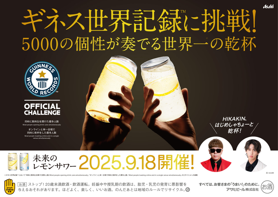 9月18日にギネス世界記録2冠に挑戦する「5000人乾杯イベント」を千葉と大阪の2つの会場で同時開催する。イベントには動画クリエイターのHIKAKIN氏とはじめしゃちょー氏が参加し、約5000人の招待客と同時に開栓して乾杯する。