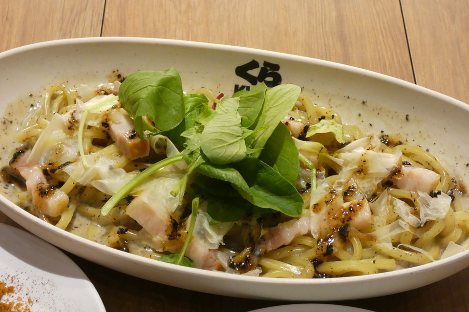 トリュフクリームパスタ風は、“パスタ風”という名前の通り、ラーメンで使用される麺を活用し、パスタ風に仕立てられたもので、香り高いトリュフクリームと黒トリュフソースをたっぷりと使用し、贅沢な風味を実現している。