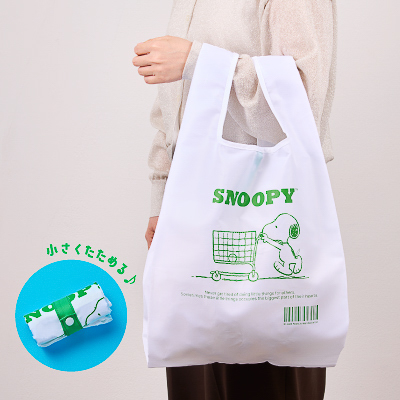 スーパーのカートを押すスヌーピーのデザインがかわいい、コンパクトに畳めるレジ袋風デザインのエコバッグ。
