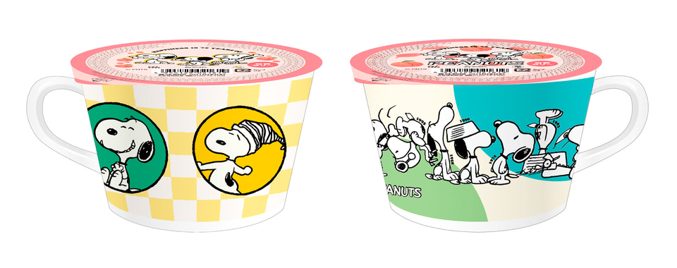 PEANUTSコミック誕生75周年を記念した、各年代のスヌーピーが楽しめるオリジナルデザインのマグが付いた白桃味のゼリー。マグカップのデザインは、2種類。