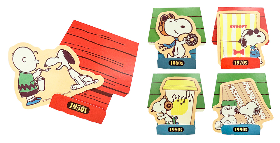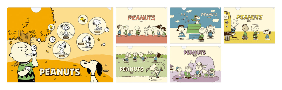 期間中に対象商品を2個購入するごとに、限定オリジナルグッズをいずれか1個プレゼント。「A4クリアファイル」は表面は1950年代から2000年までの各年代のアートを使用、裏面は各年代の名言をあしらっており、時代ごとのスヌーピーや仲間たちの魅力、スヌーピー75年の歴史が楽しめる。「台紙付きダイカットステッカー」はPEANUTSコミック誕生から50年間の各年代のアートを使用したスペシャルステッカーで、一緒に入っているスヌーピーの小屋の台紙を組み立てて飾ることもできる。