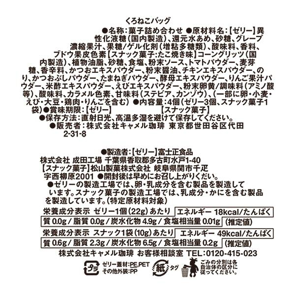 黒ネコモチーフのミニバッグ(約170×155×70mm・持ち手含まず)にスナック菓子とゼリーがセットになって価格は680円。