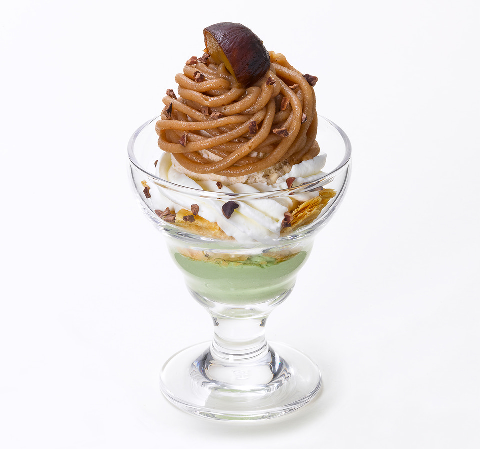 385円以上の食事とセットで注文できる、プチサイズのパフェ。「渋皮栗」と「ピスタチオ」を組み合わせ、サクサクのパイ生地、ブルーベリーソースを合わせている。