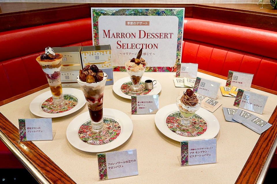 ドリンクバーで10種類以上の茶葉が楽しめる紅茶ブランド「TEARTH(ティーアース)」とのマリアージュも提案される。たとえば「フォレ・ノワール仕立てのマロンパフェ」にはルイボスティがおすすめ。ルイボスティのウッディーな香りがチェリーの酸味と調和する。