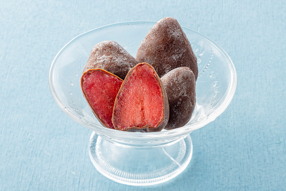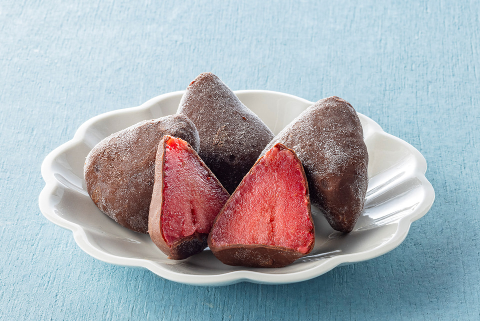 アヲハタの独自技術で冷凍加工した「いちご」を、ガーナ産カカオ豆を使ったチョコレートでコーティングした冷たいスイーツ。チョコのパリッとした食感のアクセントと、いちごの果肉感を楽しむことができる。