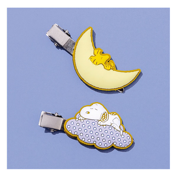 スヌーピーとウッドストックの楽しい食事のシーンがプリントされたBIGポーチと、スヌーピーとウッドストックがすやすや眠るデザインの前髪クリップ2個のセット。