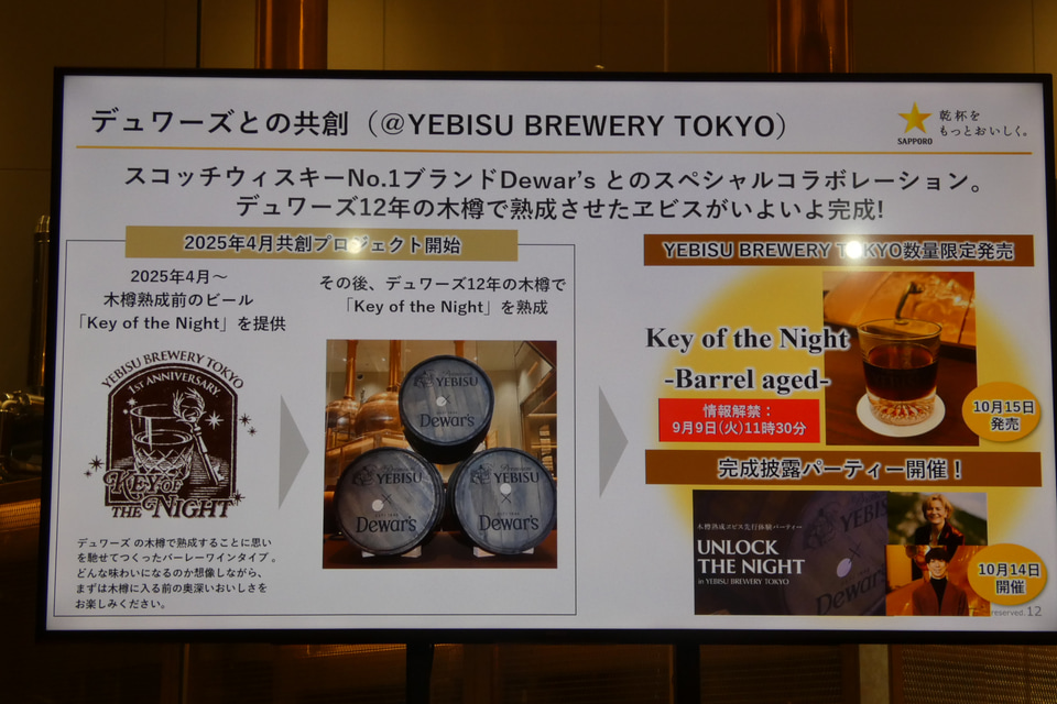 また、今年4月のYEBISU BREWERY TOKYOの開業1周年にあわせて発表されたデュワーズとのコラボレーション企画の成果物となるビール「Key of the Night -Barrel aged-」が、10月15日から同施設で数量限定で楽しめるようになる。