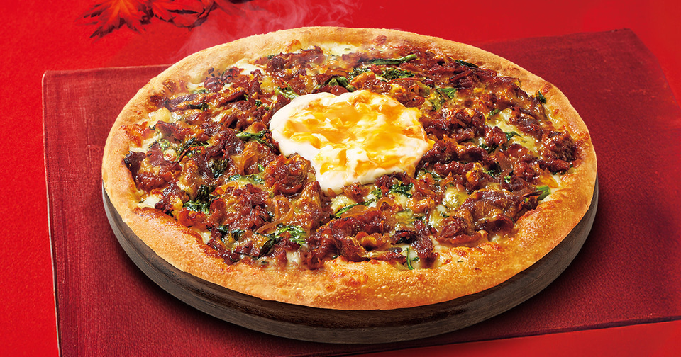 国産牛を柔らかく煮込み、甘めの割り下で味付けした本格すき焼きをピザにしたもので、しいたけやしらたきも一緒に煮込んでトッピングしている。中央にのった半熟風たまごでまろやかさが加わり、まるですき焼き鍋を囲んでいるような味わいが楽しめる。