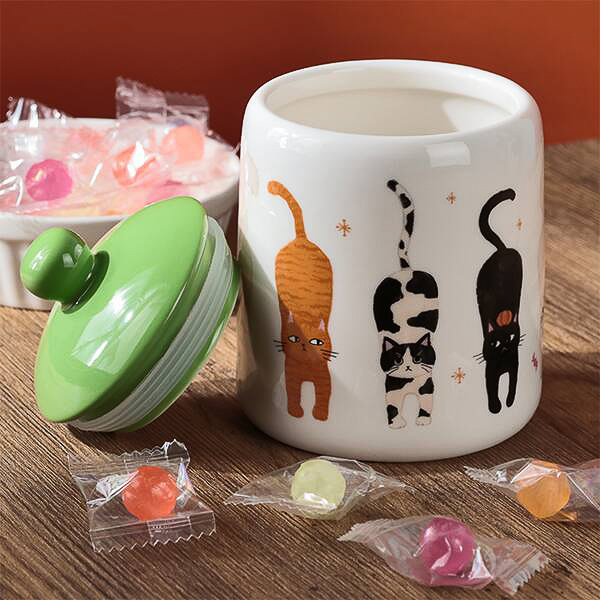 黒ネコ、トラ猫、三毛猫、いろんなネコたちがデザインされた陶器製のキャニスターで、サイズは約85×135mm(径×高さ)。レモン、オレンジ、グレープ、ストロベリー、ピーチキャンディがランダムに15個入って価格は1075円。