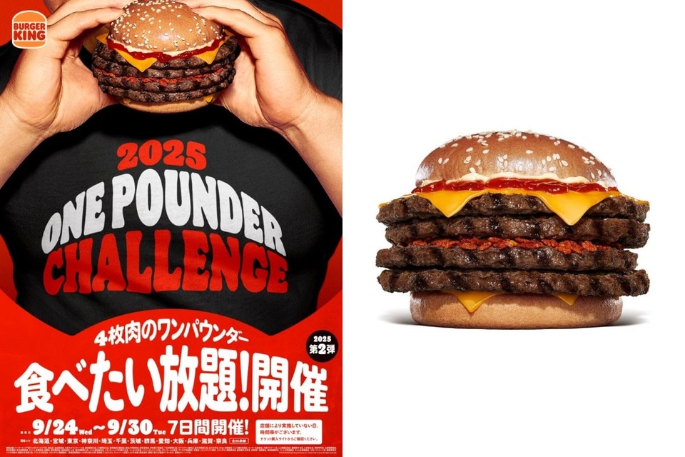 バーガーキング(ビーケージャパンホールディングス)は、ビーフ4枚を使った「ワンパウンダーシリーズ」の食べ放題イベント「ワンパウンダーチャレンジ2025」第2弾を9月24日~30日に開催する。