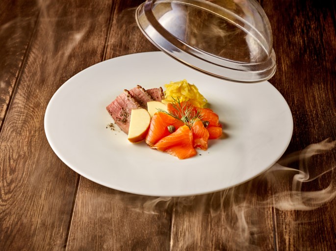 桜チップで燻製したサーモントラウト・京鴨・チーズと、黄にんじんのキャロットラペにスモークのかおりを閉じ込めた。蓋を開けた瞬間に立ち上がるスモークと香りが楽しめる。
