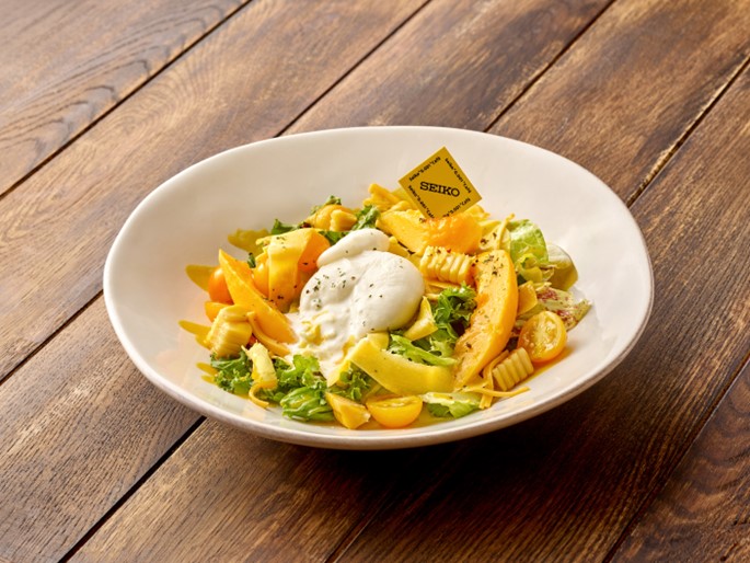 鮮やかな黄色い野菜とフルーツを使ったサラダ。切った瞬間にとろけ出す濃厚なブッラータチーズとマンゴー・パッションフルーツのドレッシングの相性のよい組み合わせが楽しめる。