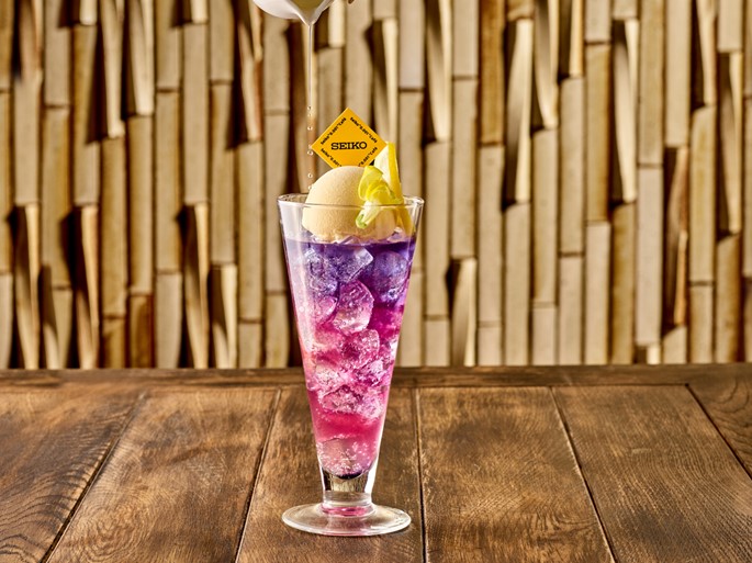 レモンシロップを入れると江戸紫色から桜色に変化するクリームソーダ。レモンの酸味とバニラアイスのクリーミーな味わいを組み合わせることで、最後の一口まで色と味の変化を楽しめる。