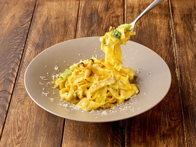 セイコーの計測機器のカラーをイメージした鮮やかな黄色の濃厚ウニクリーム・きのこ・カラスミの旨味がとけ込んだクリームパスタ。もちもち食感の平打ち麺の味わいとチーズの香りも口いっぱいに広がるという。