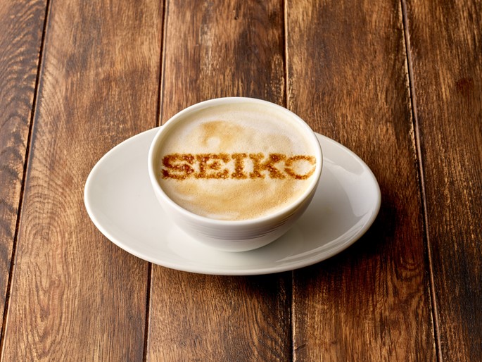 ロイヤルガーデンカフェ青山で厳選したエスプレッソにミルクをたっぷり注いだカフェラテ。セイコーのロゴをコーヒーパウダーで表現している。