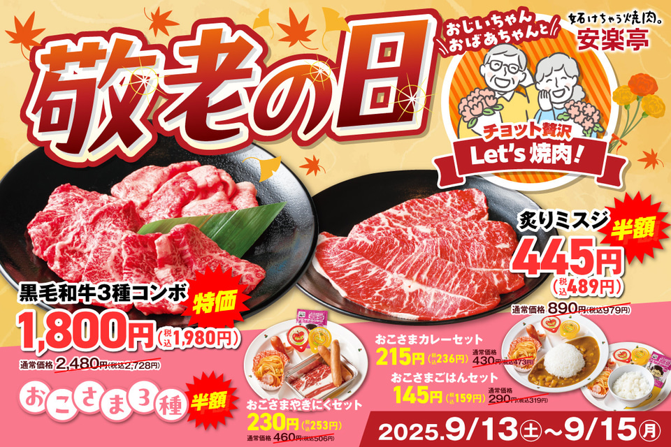 安楽亭は、敬老の日企画として9月13日~15日に「黒毛和牛3種コンボ」を特別価格で提供するほか、「炙りミスジ」「おこさまやきにくセット」「おこさまカレーセット」「おこさまごはんセット」を半額で販売する。