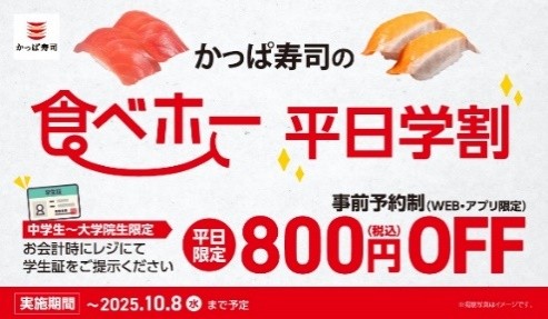 かっぱ寿司(カッパ・クリエイト)は、食べ放題「かっぱ寿司の食べホー」で、平日限定として中学生以上の利用価格を400円引きにする「平日割」を9月18日~10月1日の期間限定で実施する。