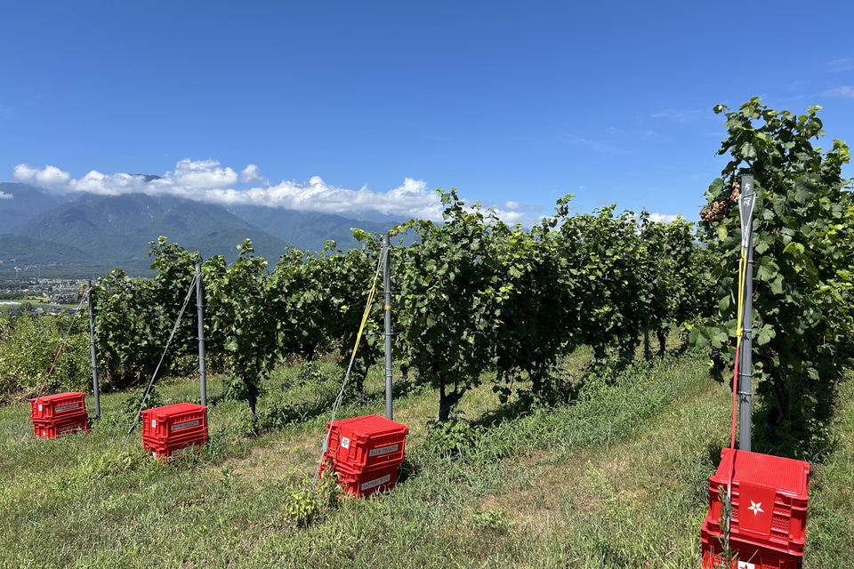 今回取材した安曇野池田ヴィンヤードは、長野県北西部の池田町の標高約560~630mの南西向きの傾斜地にある12.4haの畑。開園は2009年で、同社のヴィンヤードとしては2018年開園の北海道北斗ヴィンヤードに次いで新しい畑となる。