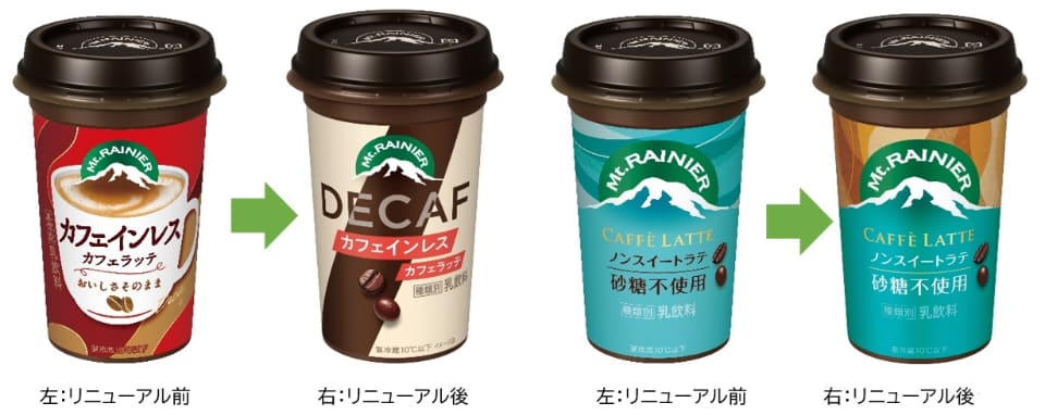 「マウントレーニア DECAF カフェインレス」は、厳選したカフェインレス豆を使用したカフェラテ。本格コーヒーのおいしさはそのままに、カフェインを90%カットしている。リニューアルにより、カフェインレスコーヒーの飲用意向の高い若年層にも手に取りやすいスタイリッシュなデザインに刷新している。