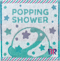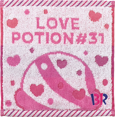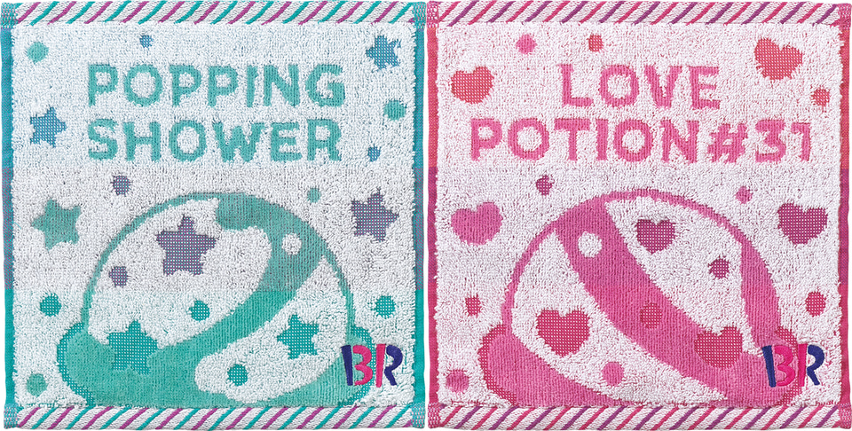 用意したUCHINO製タオルは、綿100%、無撚糸を使用したジャガード織りで、ふわふわの肌触りが特徴。デザインは「ポッピングシャワー」と「ラブポーションサーティワン」をモチーフとしたもので、サーティワンのロゴの刺繍が入っている。受け取り時は2種類のうち好きなデザインを選べる。