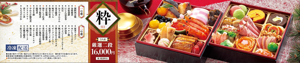 用意したのは豪華三段重「麟(りん)」と、厳選二段「粋(すい)」の2種類。海の幸や縁起物を中心に、伝統と現代の味覚を詰めている。また、「厳選お取り寄せグルメ」として「厳選本まぐろ詰め合わせ」(約450g)、「ボイルズワイガニ肩付脚」(約1.1kg)、「国産黒毛和牛スライス」(700g)も販売する。予約は11月25日まで受け付ける。