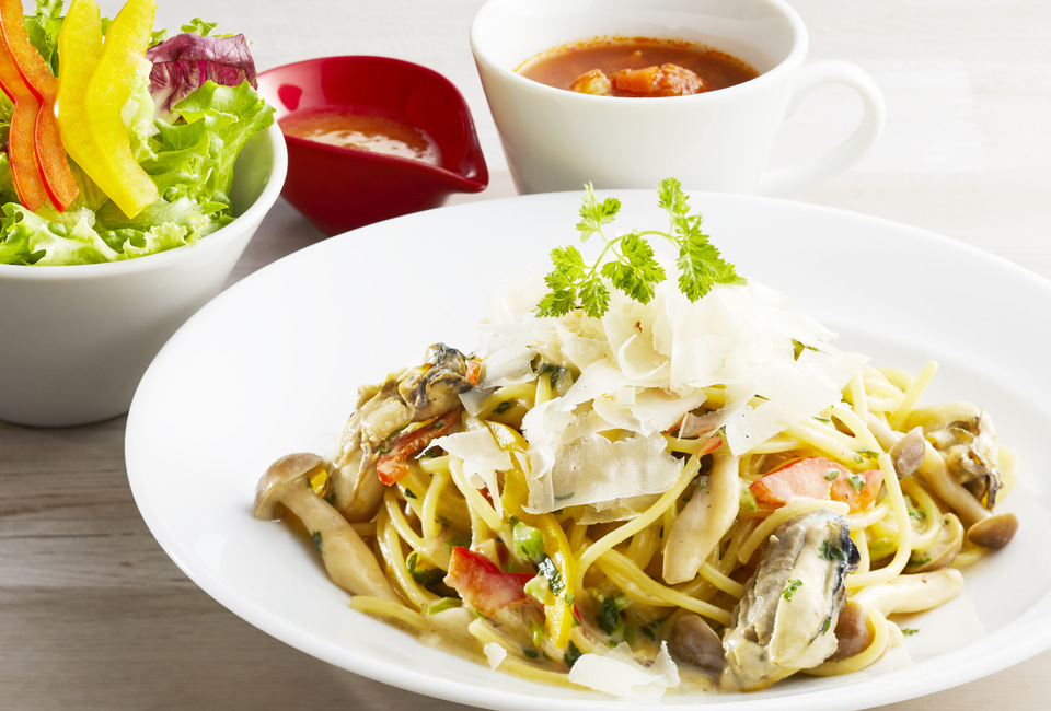 「濃厚ポルチーニクリームと牡蠣の贅沢生パスタ」は、ポルチーニの香りが口いっぱいに広がる濃厚クリームと、旨みたっぷりの広島県産の牡蠣を合わせた生パスタ。春菊をアクセントに加えている。