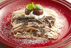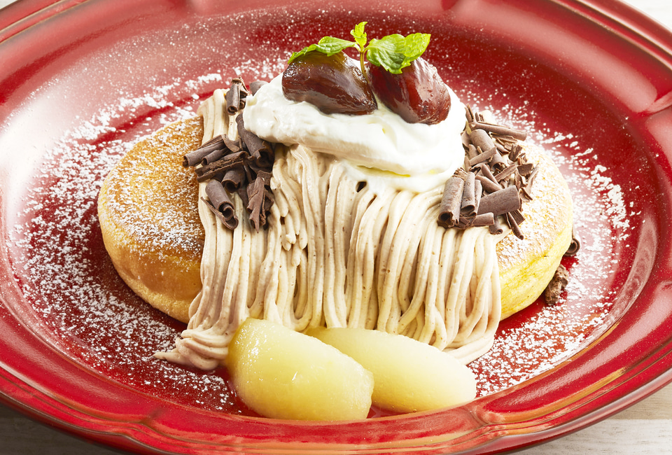 「洋梨と渋皮栗のモンブランパンケーキ」は、同店の看板商品のパンケーキを秋限定として用意したもの。滑らかなモンブランクリームと芳醇な洋梨、渋皮栗をトッピングした。