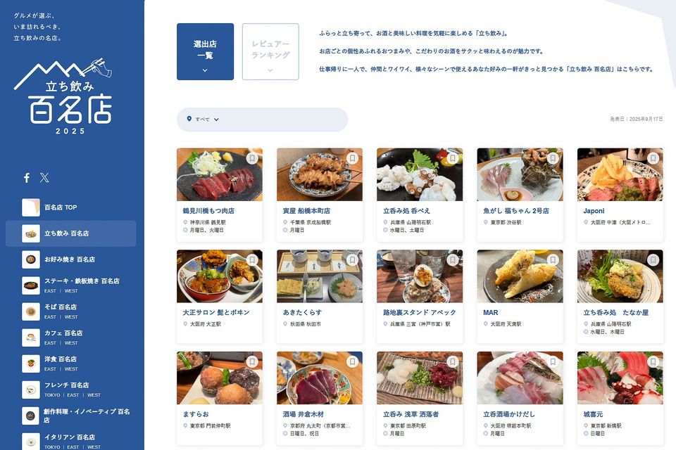 レストラン検索・予約サイト「食べログ」(カカクコム)は「食べログ 立ち飲み 百名店 2025」を発表した。