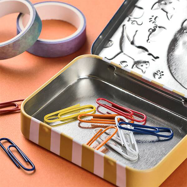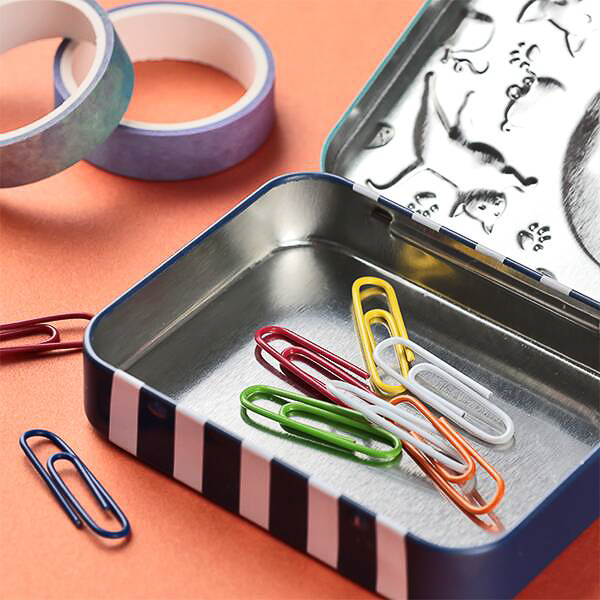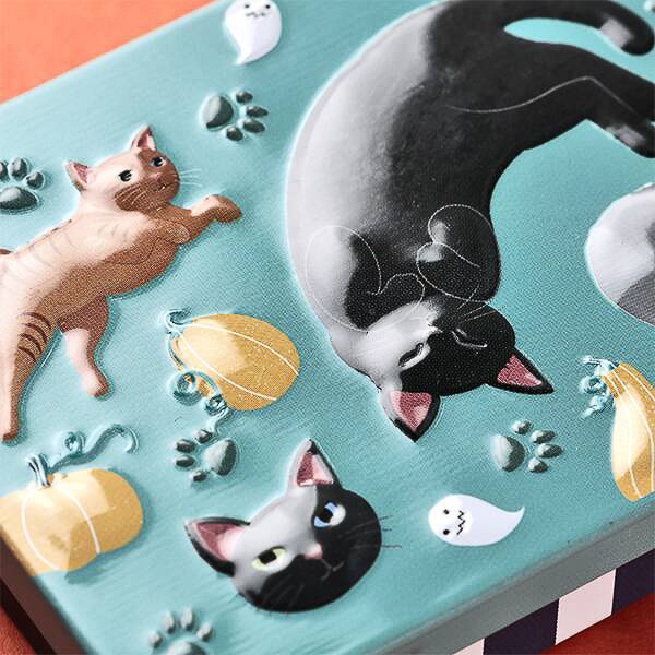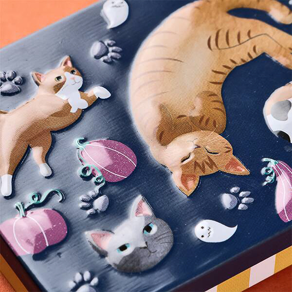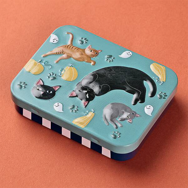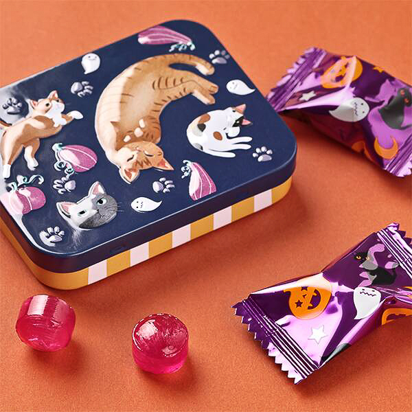 カボチャなどのハロウィンモチーフとともにネコたちをエンボス加工でデザインしたスクエア缶で、サイズは約80×65×15mm。グレープ風味のキャンディが4粒入っており、食べ終わった缶は小物入れとして活用できる。