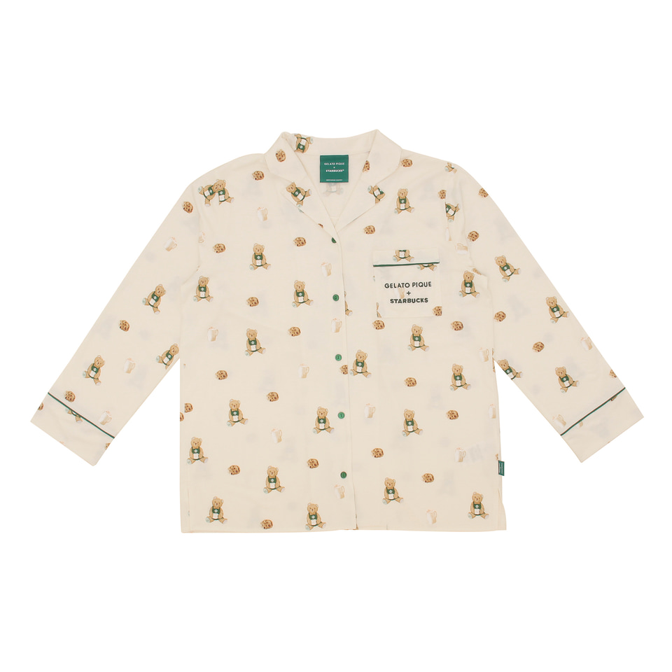 なめらかな肌触りの総柄シャツ。今回のコラボのために描き下ろされたイラストには、スターバックスのチョコレートチャンククッキーやキャラメルマキアートをイメージしたモチーフ、そしてグリーンエプロン姿でマグカップを抱えるピケベアが描かれている。ゆったりとしたシルエットのシャツは、ボタンとパイピングにスターバックスグリーンをきかせ、胸ポケットにはコラボロゴを刺繍で施している。