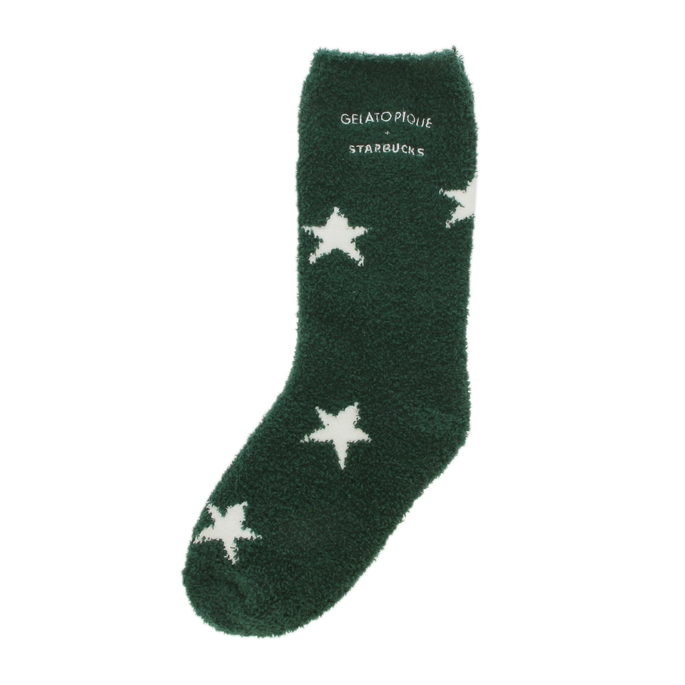 さらりとした肌当たりの、パウダリーなもこもこ素材を使用したルームソックスをスターバックスらしいグリーンに。たくさんの星のモチーフをジャガードで散りばめ、サイドにはコラボロゴを刺繍している。