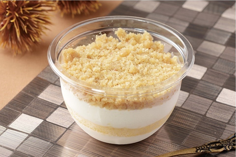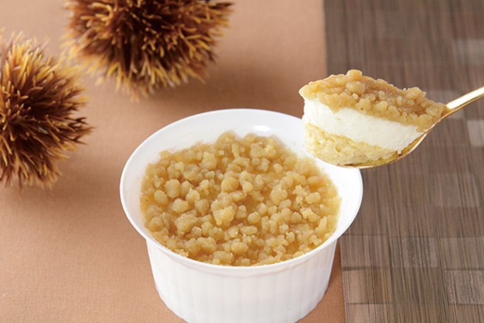 和栗ペーストが入ったベイクドチーズケーキ×レアチーズケーキの2層仕立てにし、ほろふわ栗粉をのせた。※沖縄エリアのローソンでは販売なし