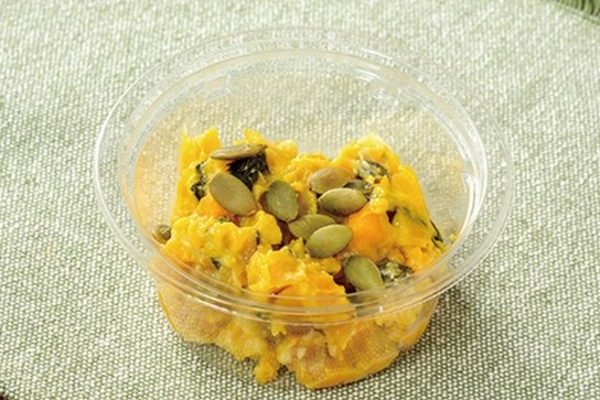 南瓜の種をのせた、なめらか食感の甘い系おつまみサラダ。※関東エリア(ナチュラルローソンを除く)・ 中部エリアのローソンでは、ホイップクリームを添えた南瓜とナッツのメープルサラダを発売。ナチュラルローソンでの販売なし