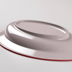 プラスチック樹脂の素地にウレタン塗装を施し、伝統的な山中塗(石川県加賀市・山中地区)の技術を活かしてつくられたカレー皿は、軽くて割れにくく、電子レンジや食器洗浄機にも対応。オーバル型で片側に向けて底面にゆるやかに傾斜がかかっているため、ルーをすくいやすくなっている。カレー皿のサイズは約280×195×45mm(幅×奥行き×高さ)。
