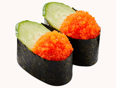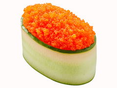 ししゃも卵ときゅうりを合わせた軍艦。きゅうりのシャキッと感と、ししゃもの卵のプチプチとした食感が楽しめる。