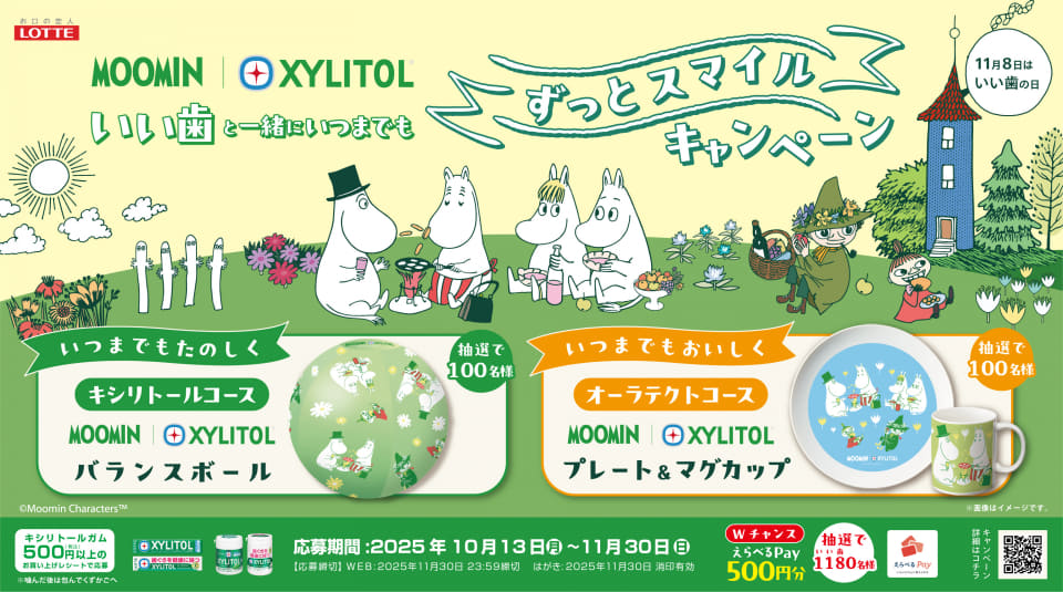 また、抽選でムーミンデザインのバランスボールやプレート&マグカップなどが当たる「いい歯と一緒にいつまでも ずっとスマイル」キャンペーンを実施する。
