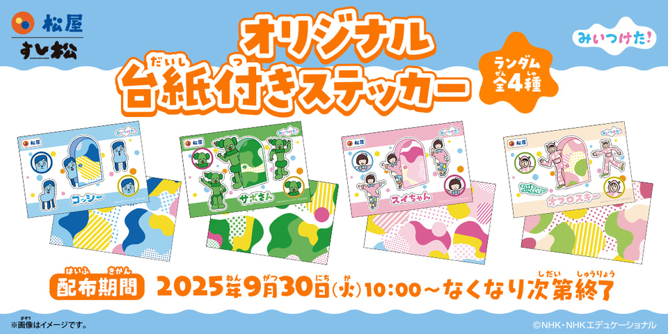 対象メニュー1品の注文につき、松屋×「みいつけた!」コラボ限定「オリジナル台紙付きステッカー」(デザインは全4種類)を1枚、ランダムでプレゼント。