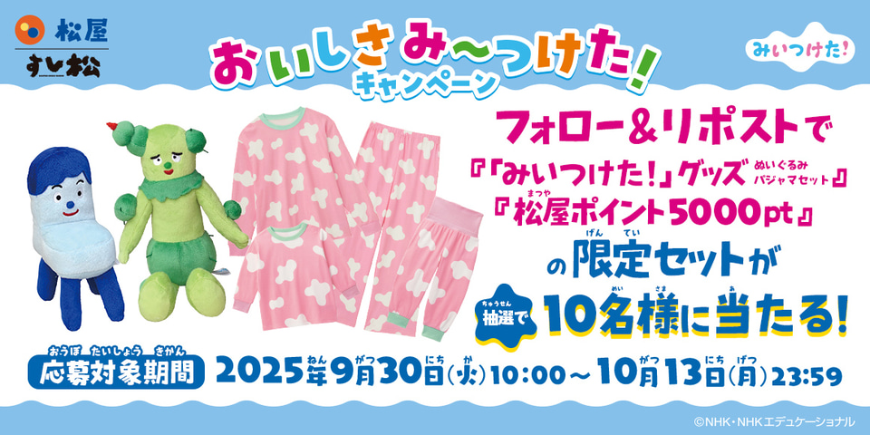 牛めし・カレー・定食・その他丼の「松屋」とすし専門店「すし松」(松屋フーズ)は、Eテレの番組「みいつけた!」とコラボレーションした「おいしさみ~つけた!」キャンペーンを9月30日10時に開始する。