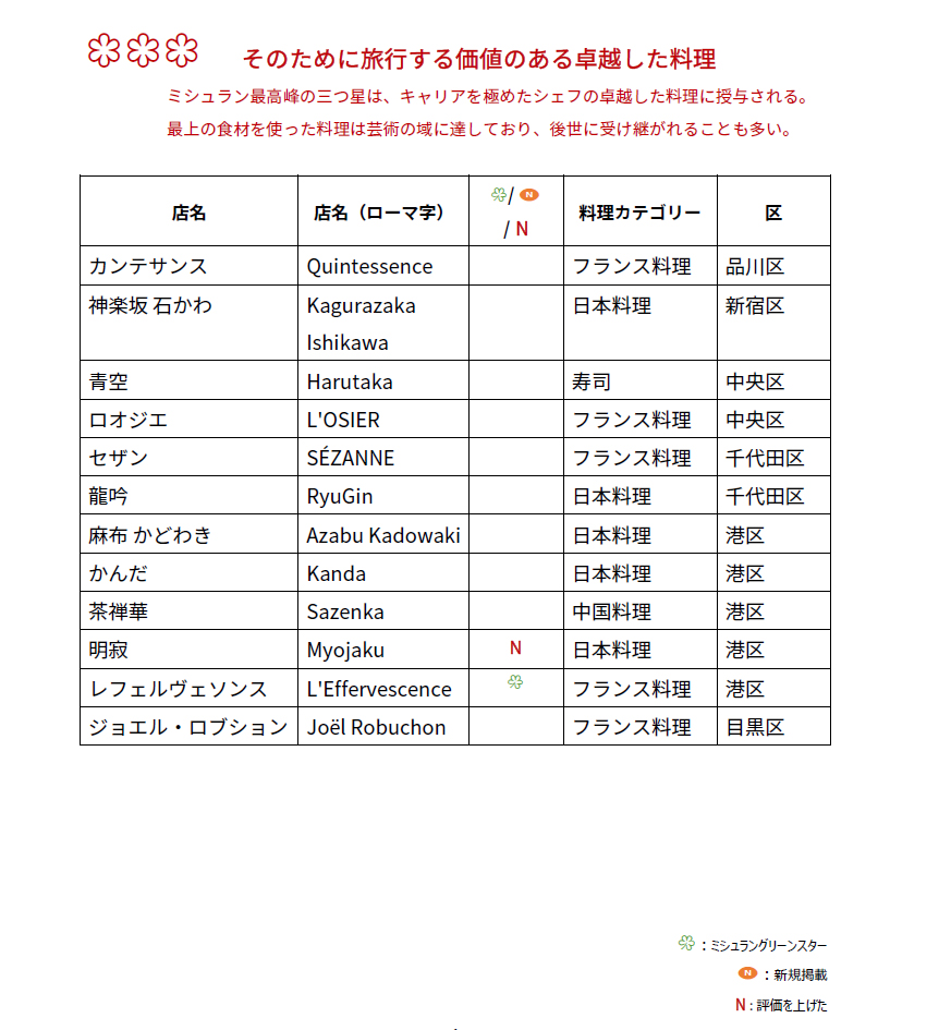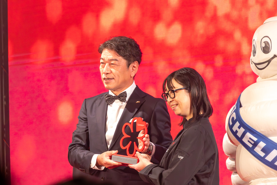 セレモニーでは、三つ星を獲得したお店、新たに二つ星を獲得したお店、新たに一つ星を獲得したお店のほか、ミシュラングリーンスターを獲得したお店が表彰された。さらに、後進の育成に力を入れている人を称える「メンターシェフアワード」、おもてなしに優れたプロフェッショナルなスタッフに贈られる「サービスアワード」、ワインの専門知識やサービス技術に優れたソムリエに授与される「ソムリエアワード」の表彰も行なわれた。