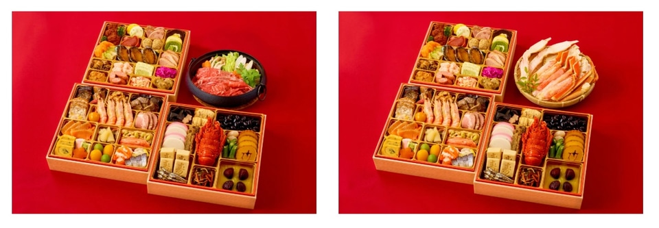 京都・祇園の老舗「ぎをん や満文」が監修した華やかなおせち三段重。一の重には祝い肴を中心に盛り込み、二の重には焼魚や肉料理などの料理を入れ、三の重には洋風・中華風の料理を詰め合わせた。さらに、すき焼き肉もしくはボイルずわい蟹がセットになっている。