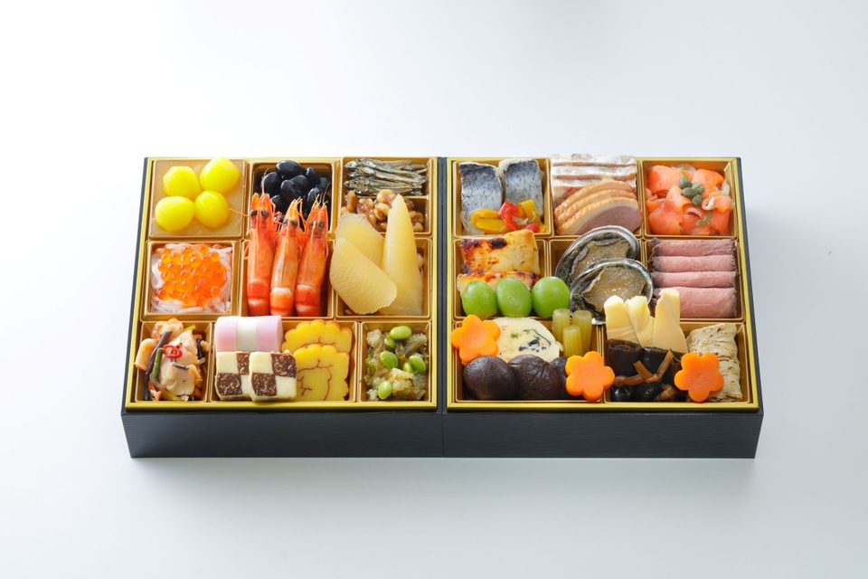伝統的な和の味わいと彩り豊かな和洋折衷の品々が楽しめる二段重。豪華なローストビーフや味わい深い蝦夷あわびの旨煮など、和と洋の贅沢な味わいが詰まっている。