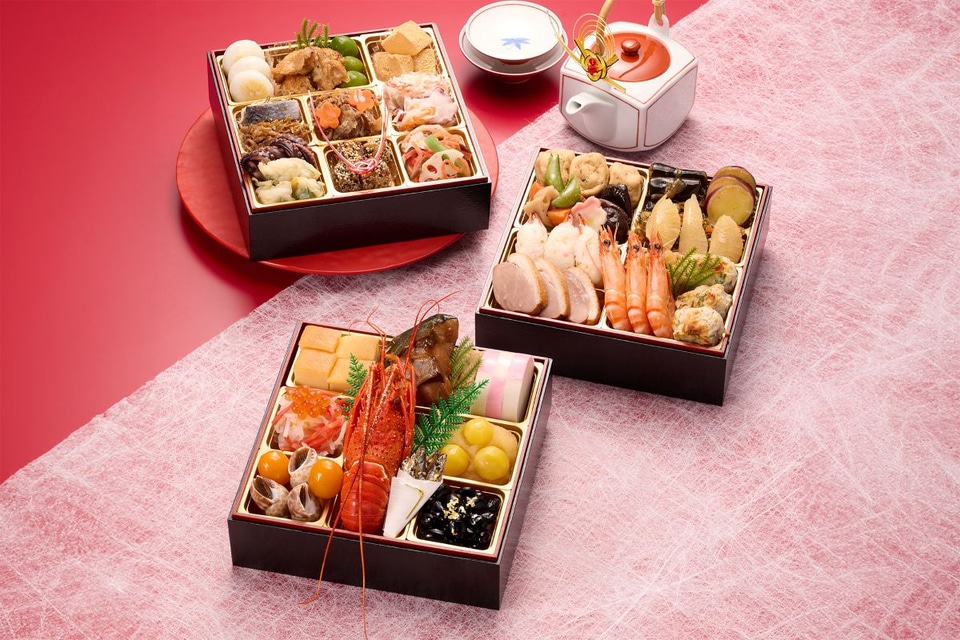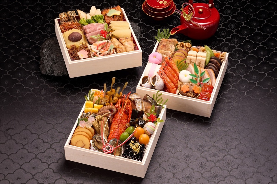 和の重には伝統的なおせち食材と、こはだかぶら和えや柔らかく炊き上げた白花豆煮が、洋の重には十勝ハーブ牛ローストビーフやロブスターが入る。中華の重には、豚を黒糖で仕上げたローストポークと鮑煮が入っている。