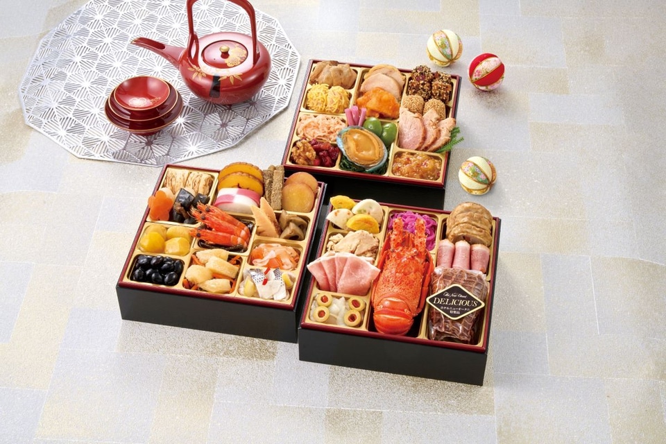 おせちの定番献立とロブスターを1尾盛り込んだ、お得で華やかな三段重おせち。江口大将こだわりのちりめん山椒が入る。