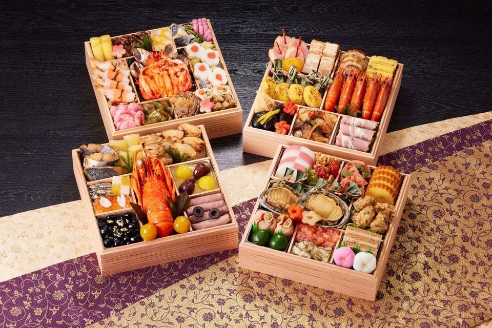 ロブスター・あわび・花咲ガニ・大ぶりな海老など与段重のすべてに目を引く豪華な料理を配し、おせちの定番や魚介類、肉類、煮物などバランスよく67種の料理を盛り込んだ。