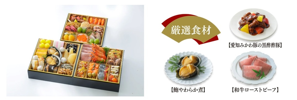 多彩な味わいの和洋中三段重に、鮑や和牛ローストビーフ、愛知みかわ豚の黒酢酢豚などプレミアム食材をふんだんに盛り込んだ。